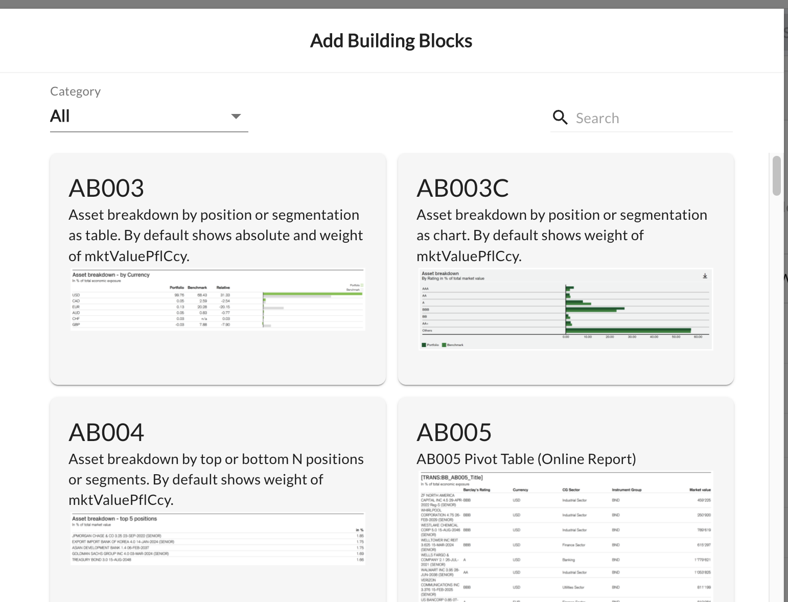 Building blocks are the smallest elements that define a part of the report. Building blocks can be selected a catalog of building blocks: