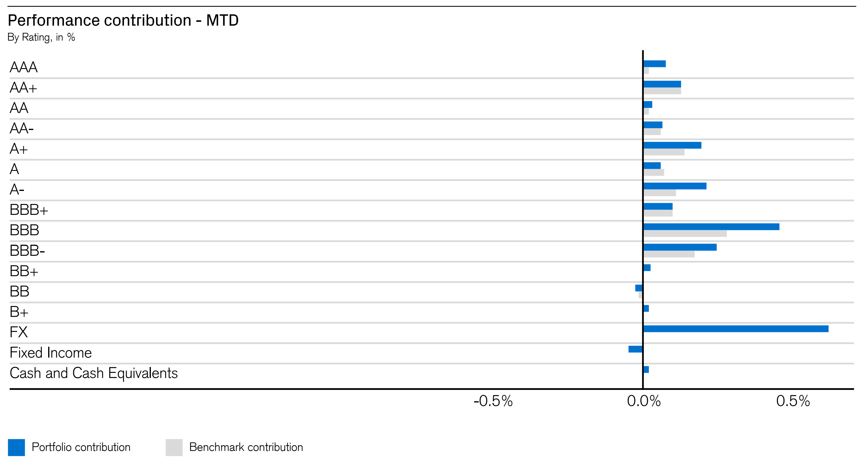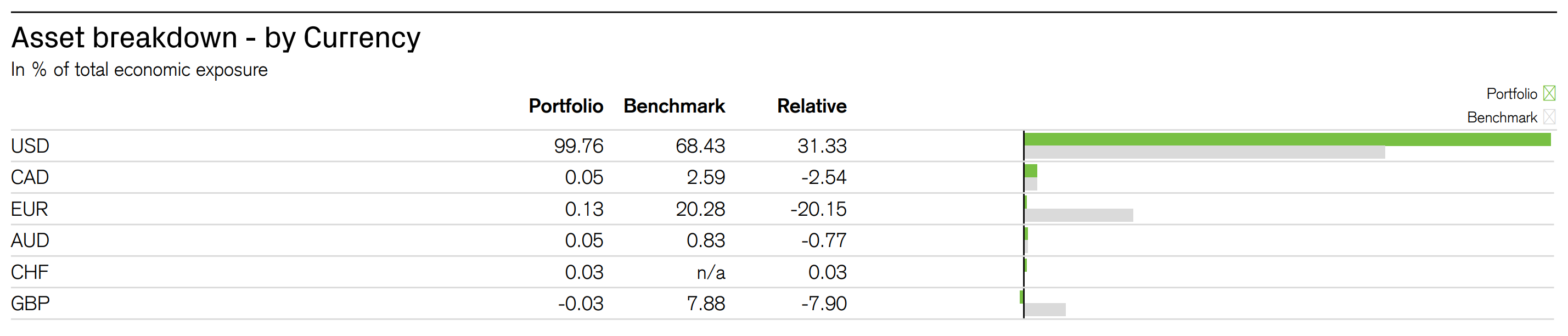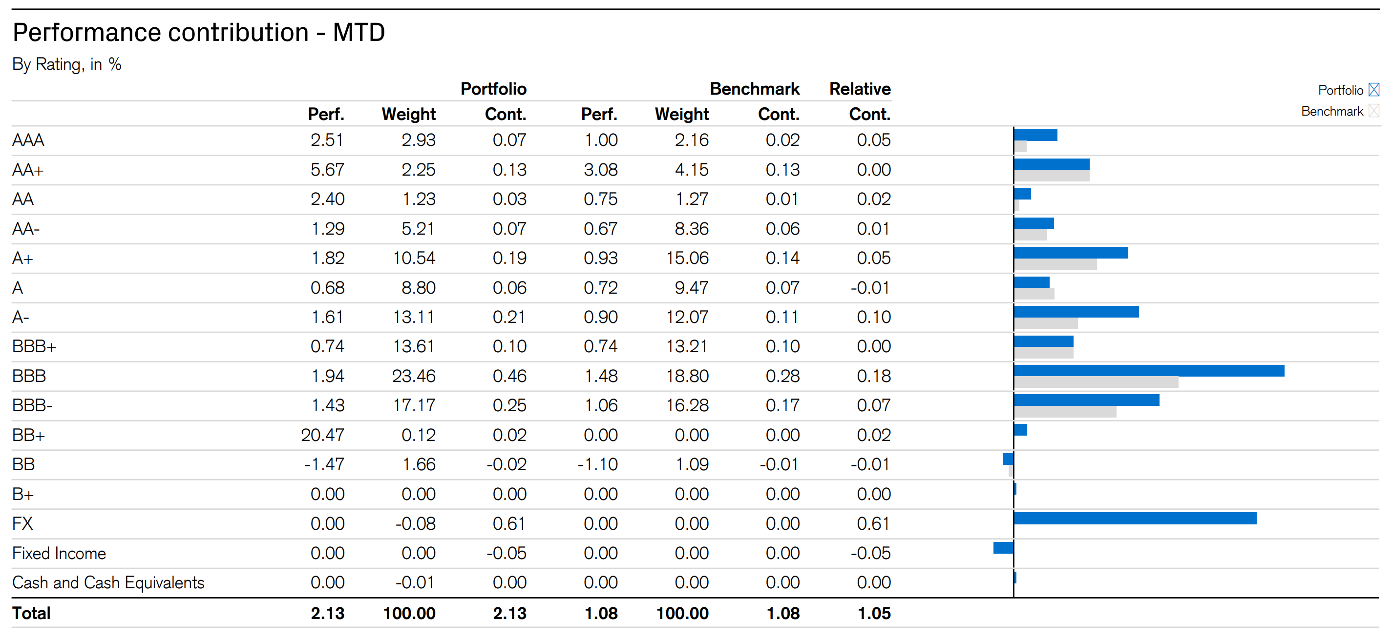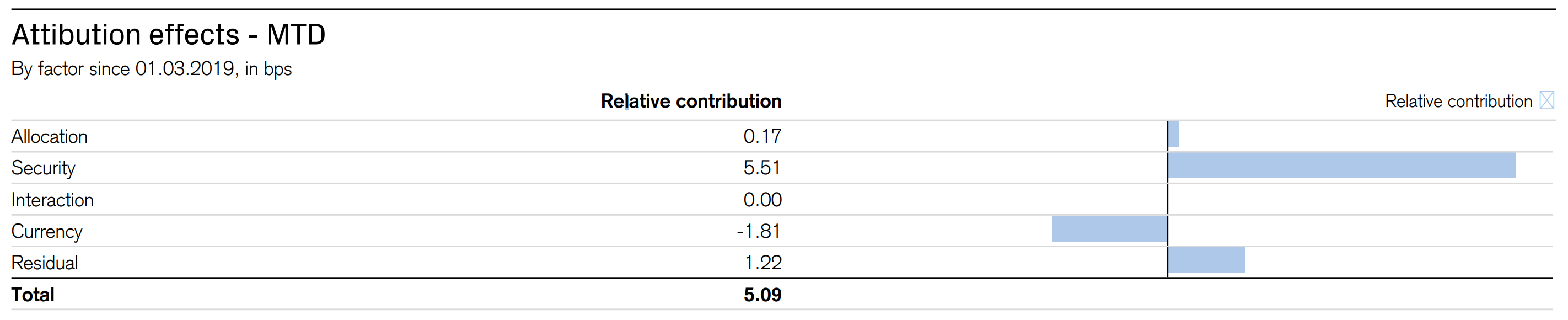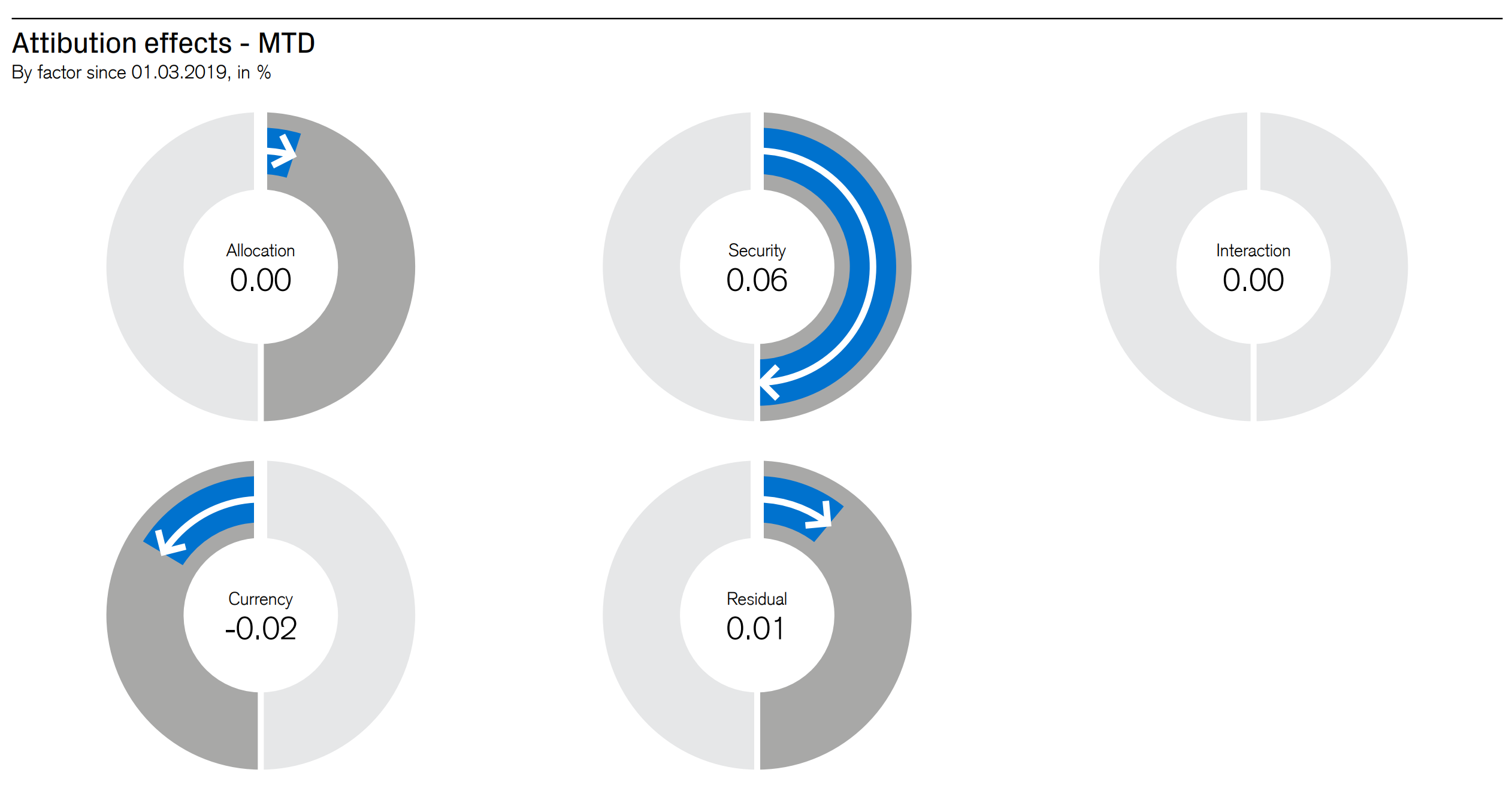 | ![]() Contribution MTD ![]() Contribution vs. Benchmark Barchart ![]() Contribution vs. Weight Scatter Plot ![]() Attribution MTD ![]() Attribution effects ![]() Attribution effects as chart And many more… |