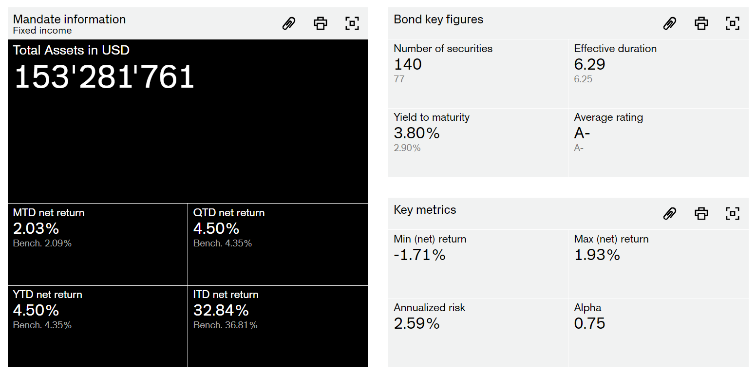 Key Figures Block | Flexible building block to report on key figures on portfolio level (e.g. “Total assets” or “Percentage invested in bonds” etc.) | ![]() (Risk) Key Figures ![]() Key figures / key metrics |