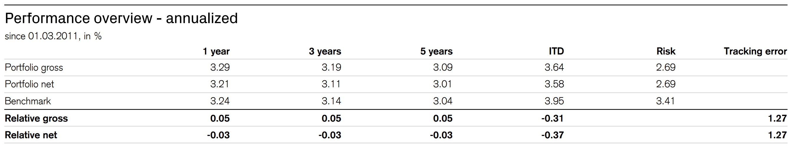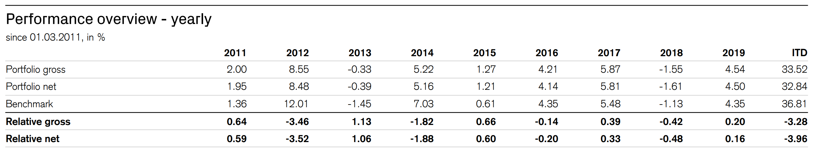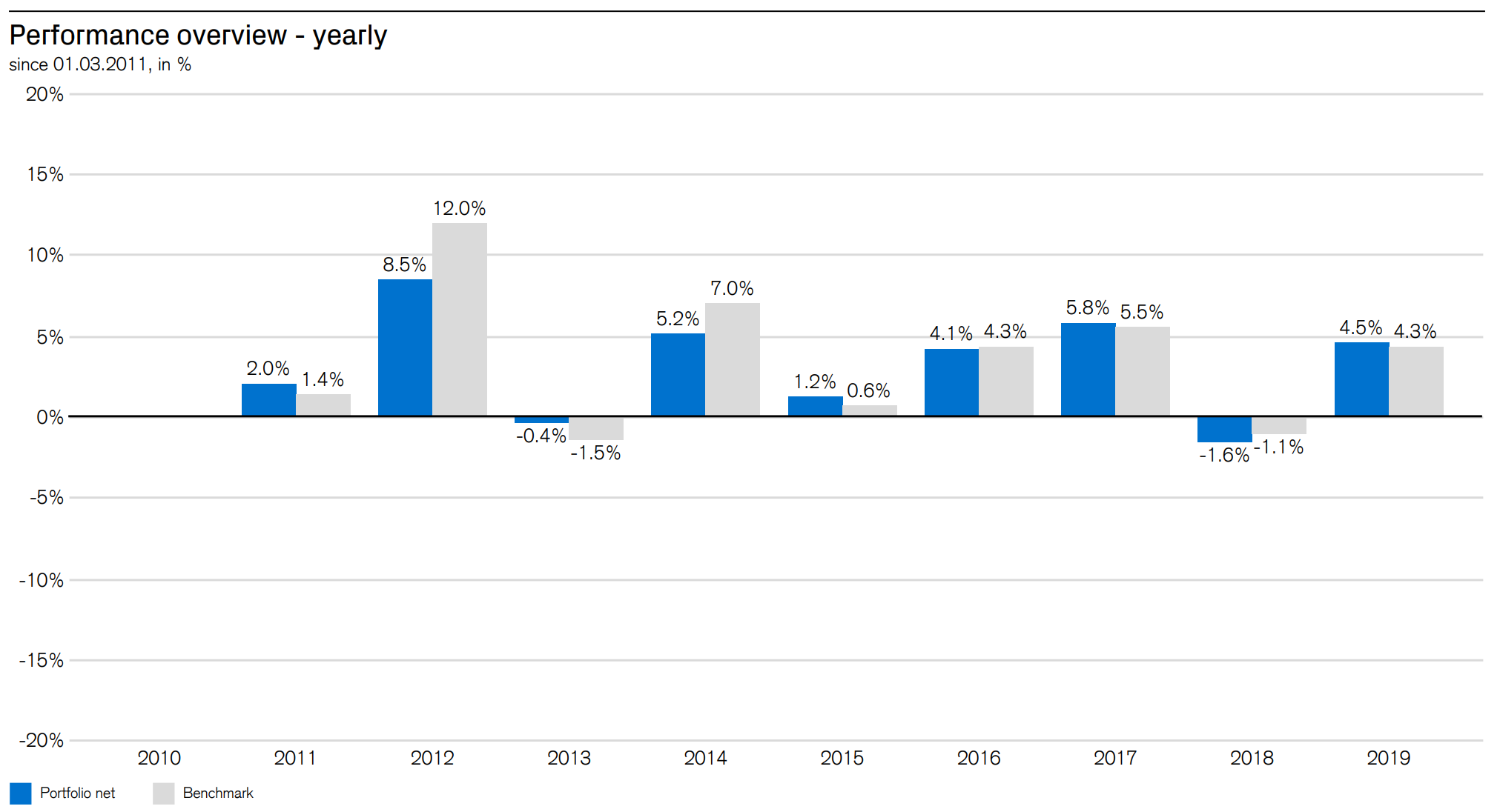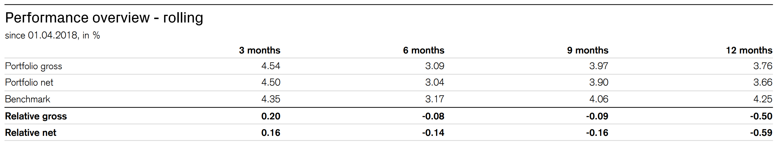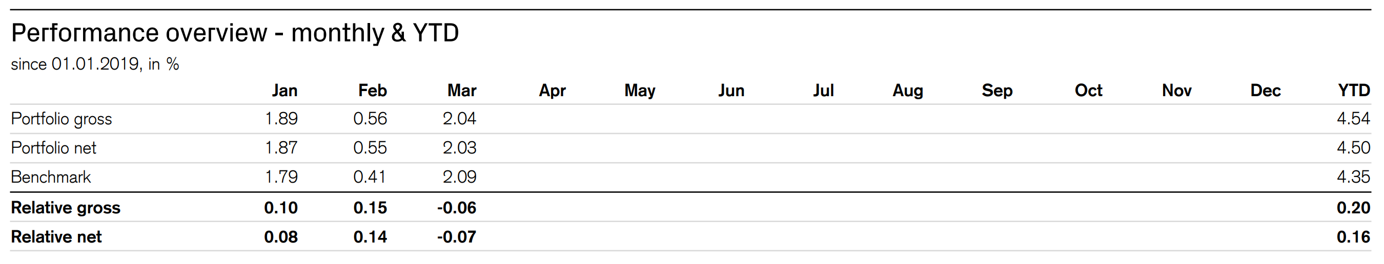 | ![]() Performance monthly for YTD ![]() Performance yearly ![]() Performance yearly as chart ![]() Performance chart YTD ![]() Performance chart Long-term ![]() Performance rolling periods ![]() Performance chart rolling periods ![]() Performance annualized ![]() Performance chart annualized And many more variants |
