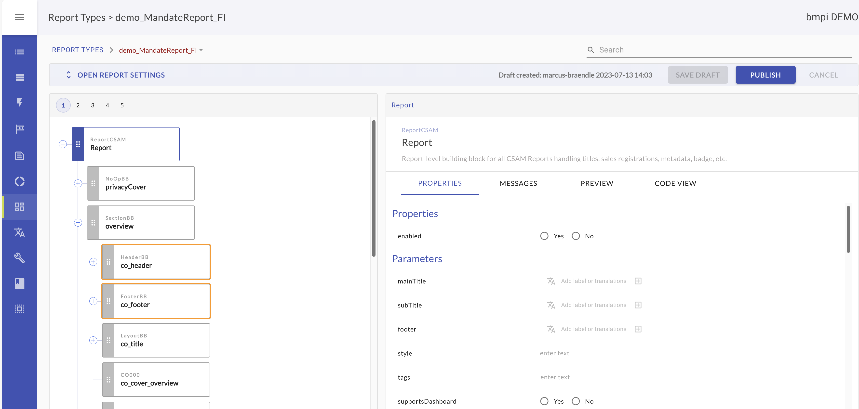 Design a very flexible way to configure abstract client reports (to be later rendered for a channel) by using building blocks and (business) parameters.