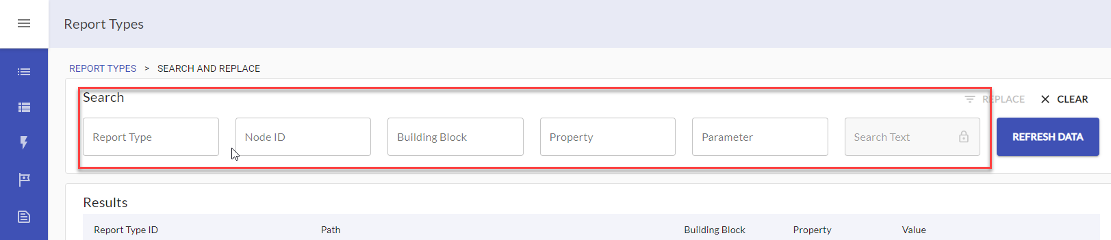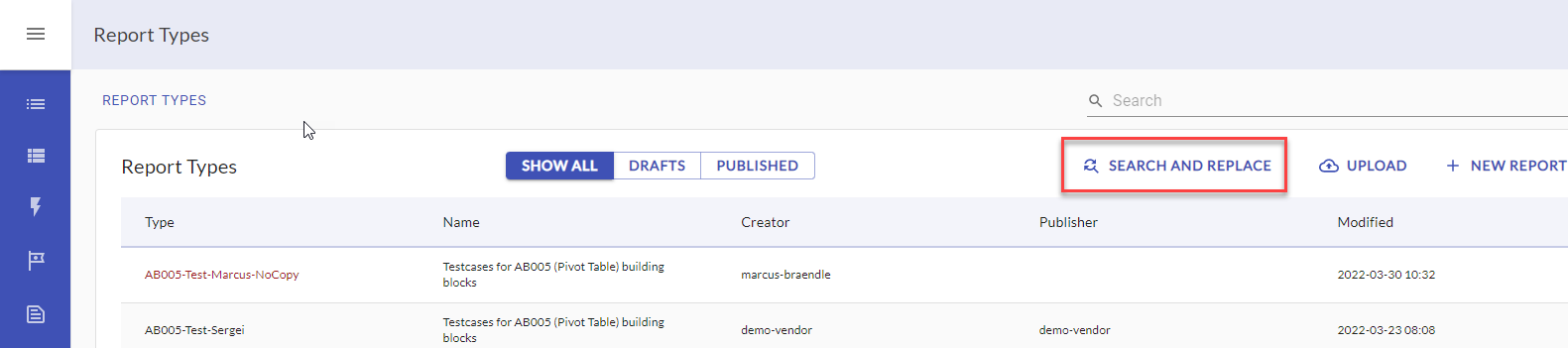 The advanced search can be opened by clicking on the “Search and Replace” button in the top bar of the list of report types: