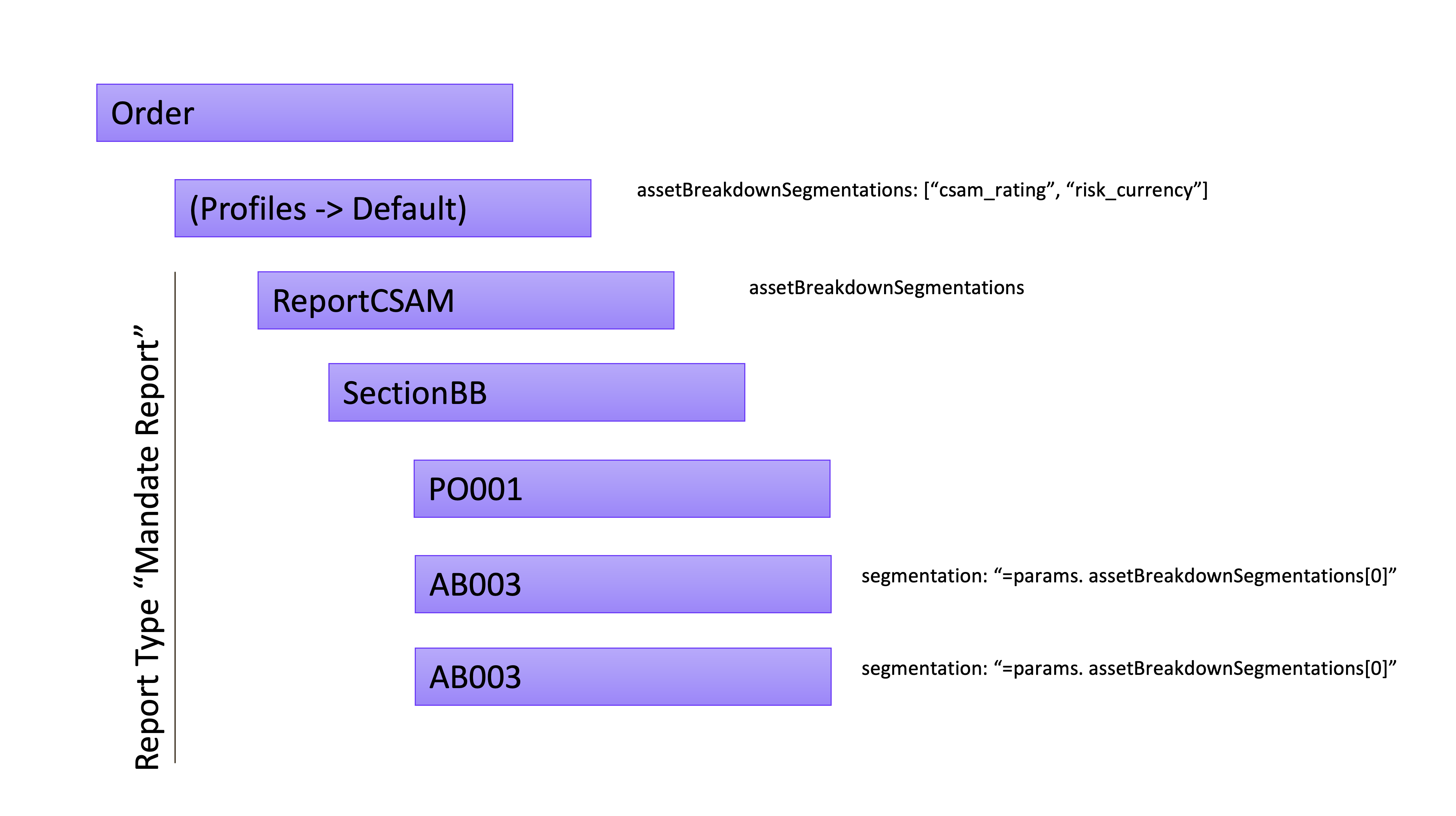 Report Type: many parameters have to be mapped from an order/profile level to the individual building blocks parameters. This happens within the definition nodes of a report type (see also Working with Report Types). Example: To show the asset allocation of a previous month end, the report type would redefine the parameter | |