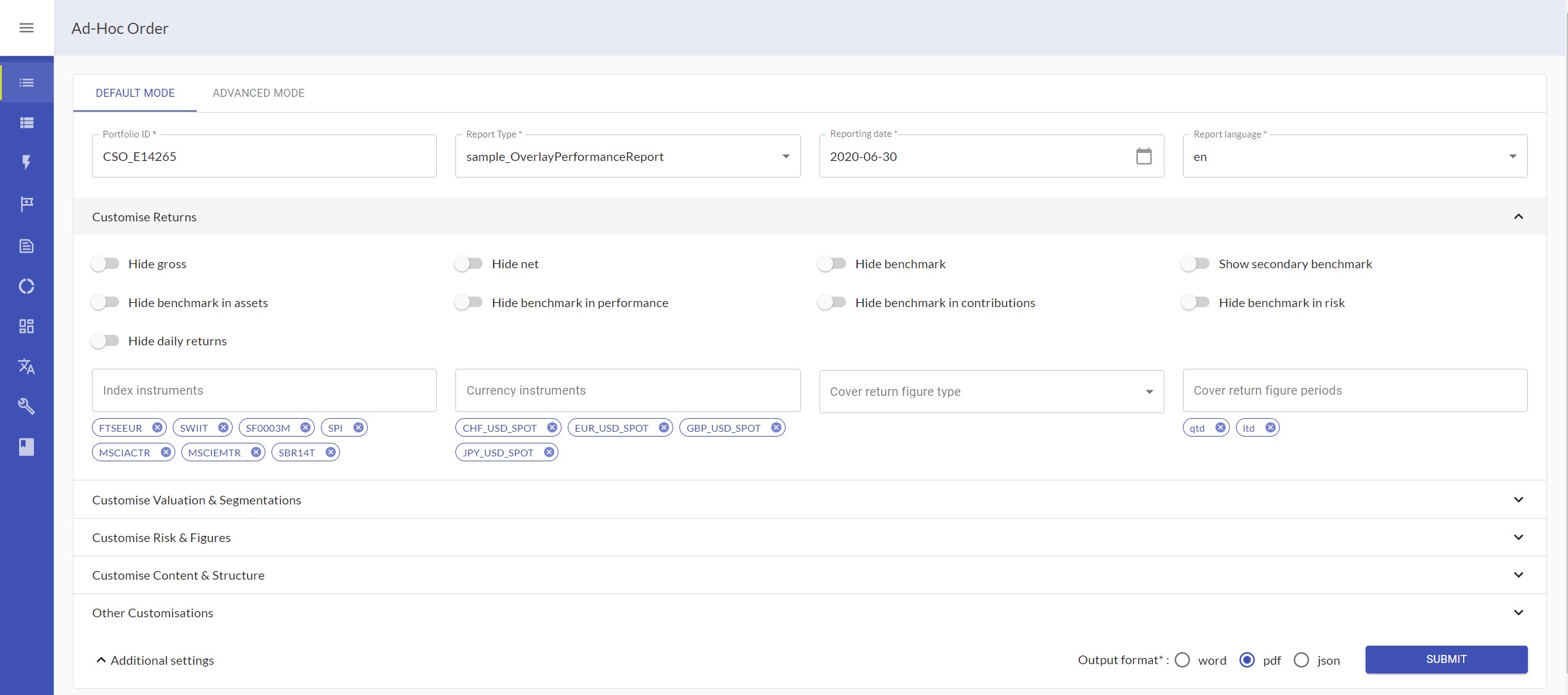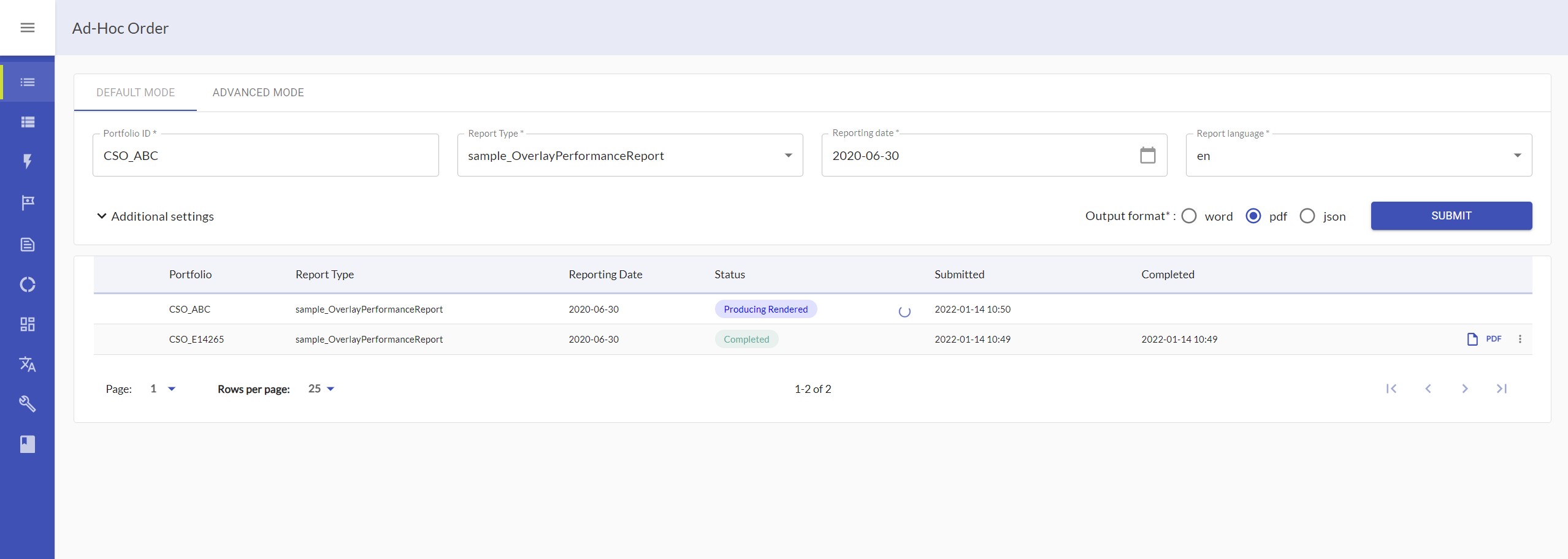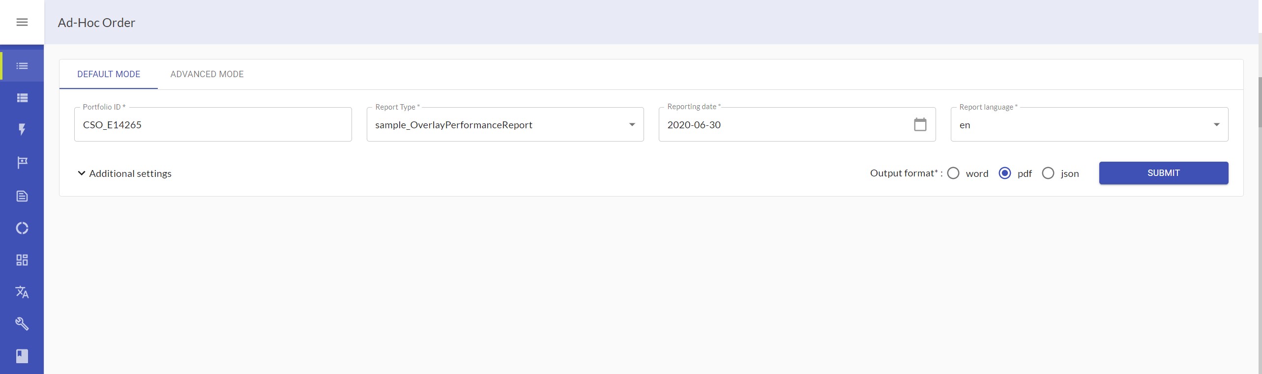 The web order interface can be used to run ad hoc orders. Cinnamon only requires four fields to run a basic report: portfolio’s ID, the report type, language and reporting date. Enter the desired values and click submit to start the production. To generate multiple reports, simply change the parameters and click submit again. It is possible to run multiple reports at the same time. | ![]() Ad Hoc Order - enter ad hoc order details |