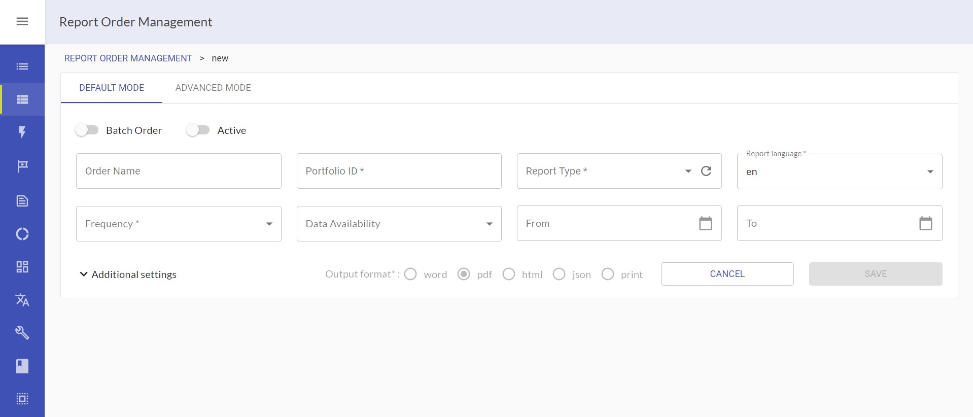 Open the report order management UI. To create an order, click on “New Order“. | ![]() Scheduled order - Blank new order |