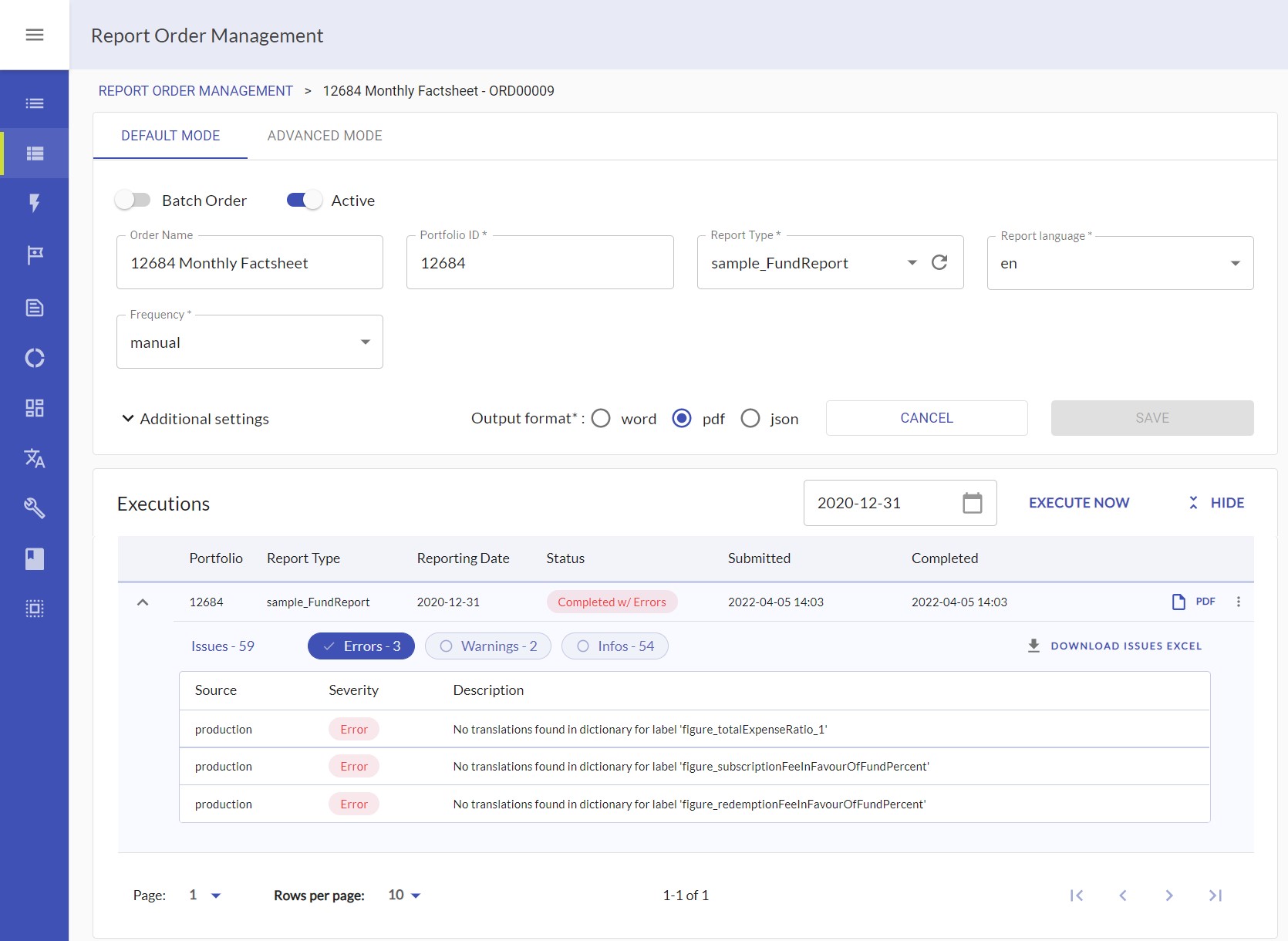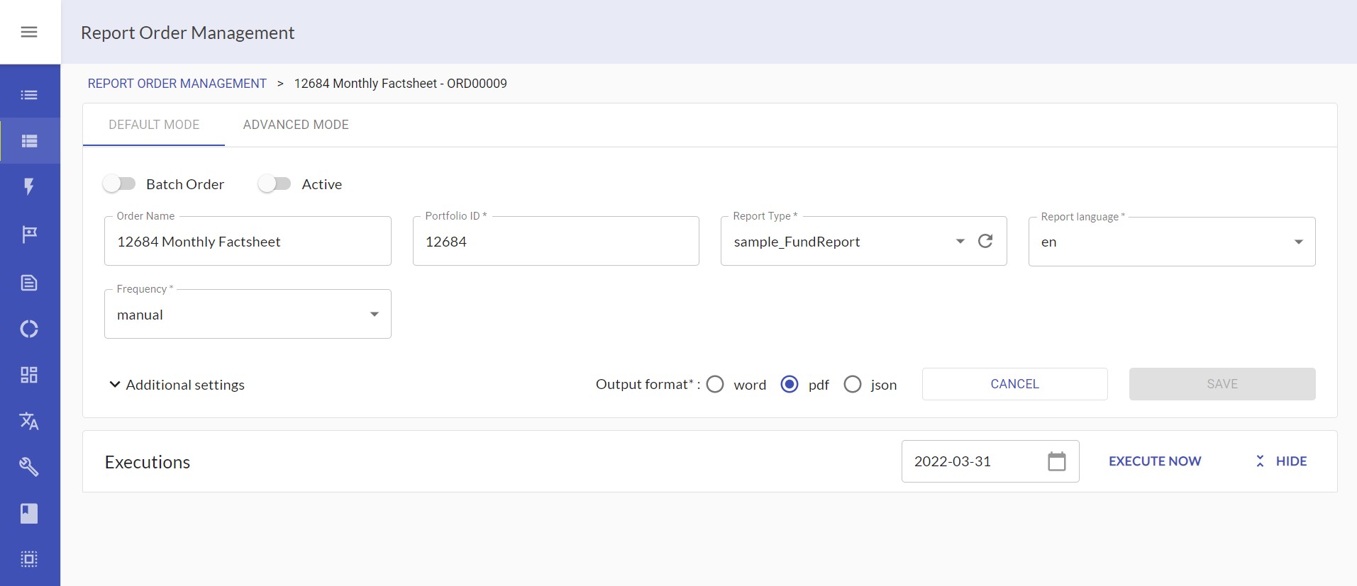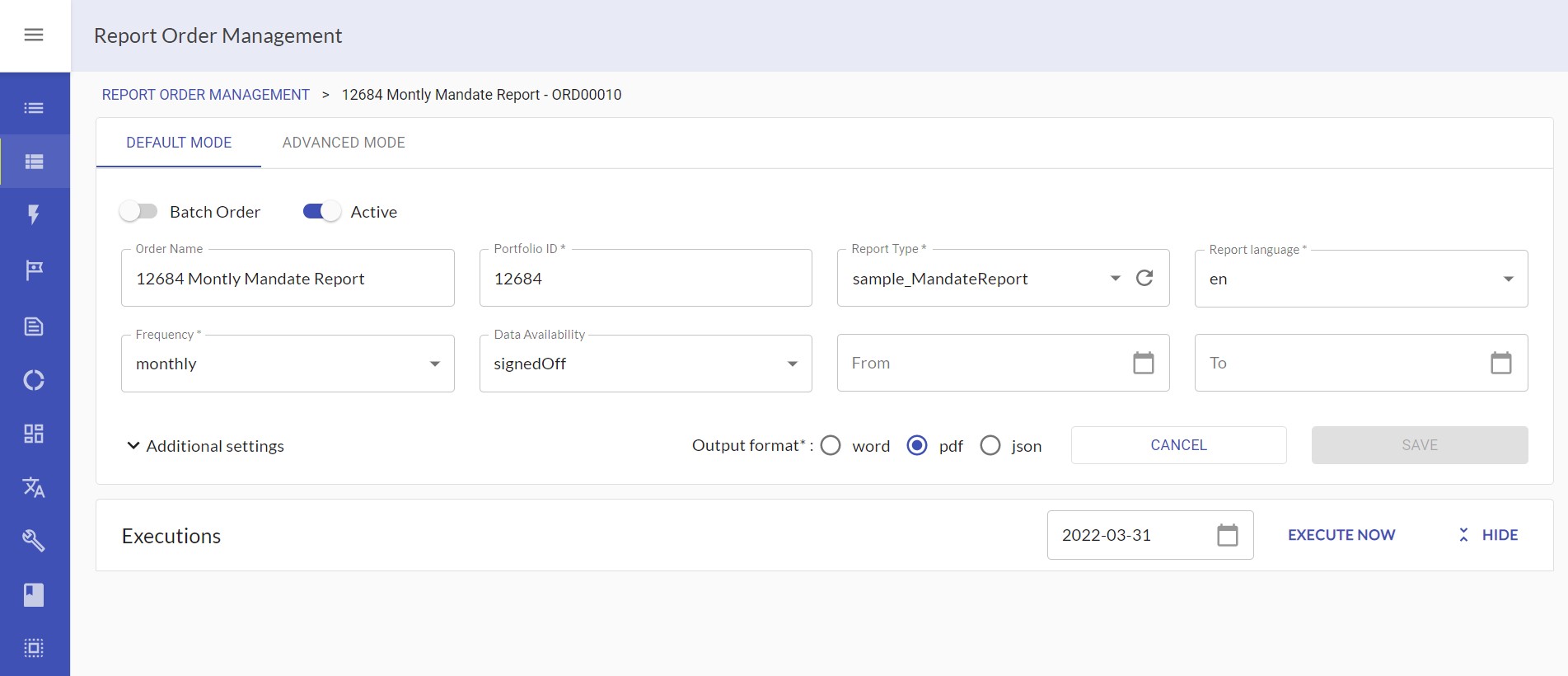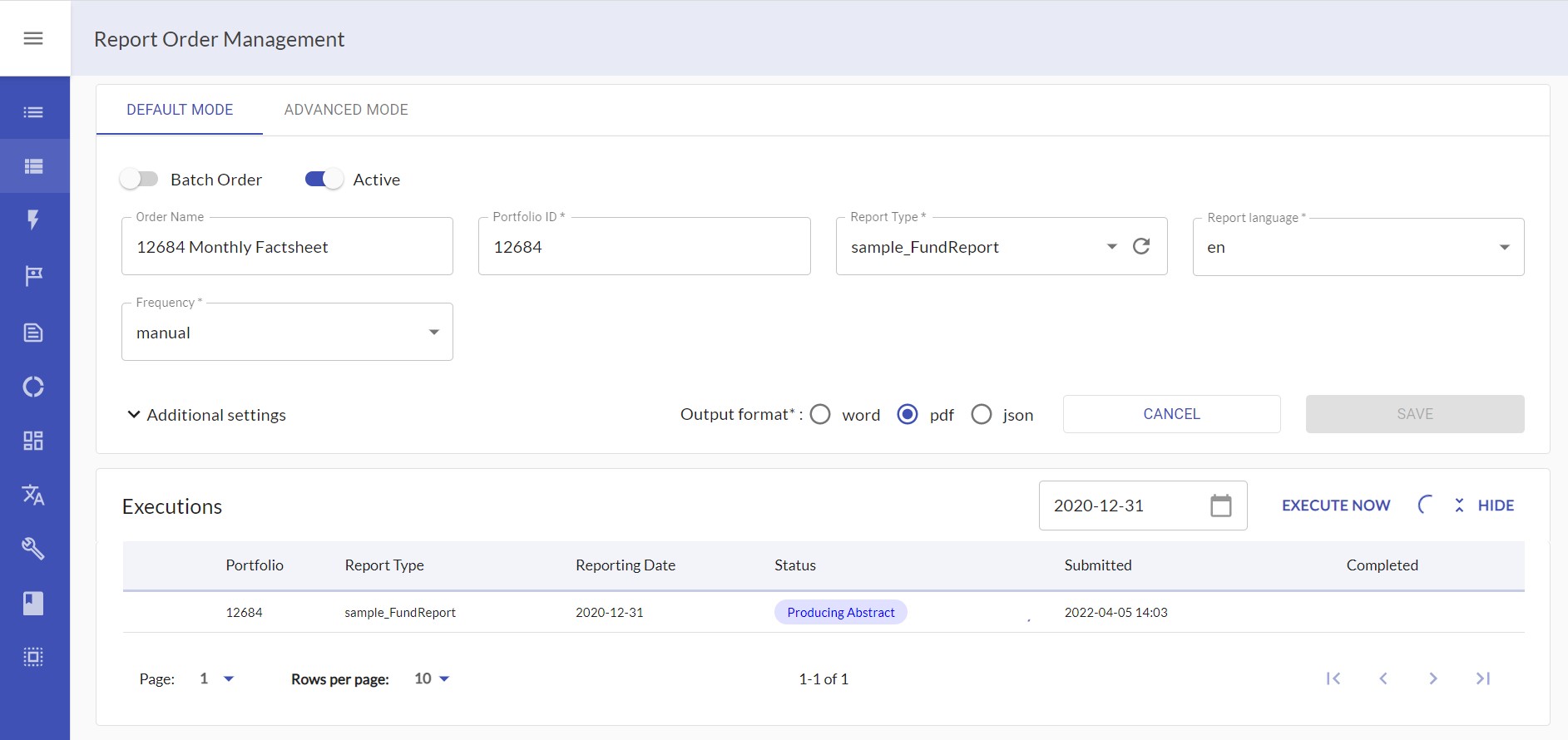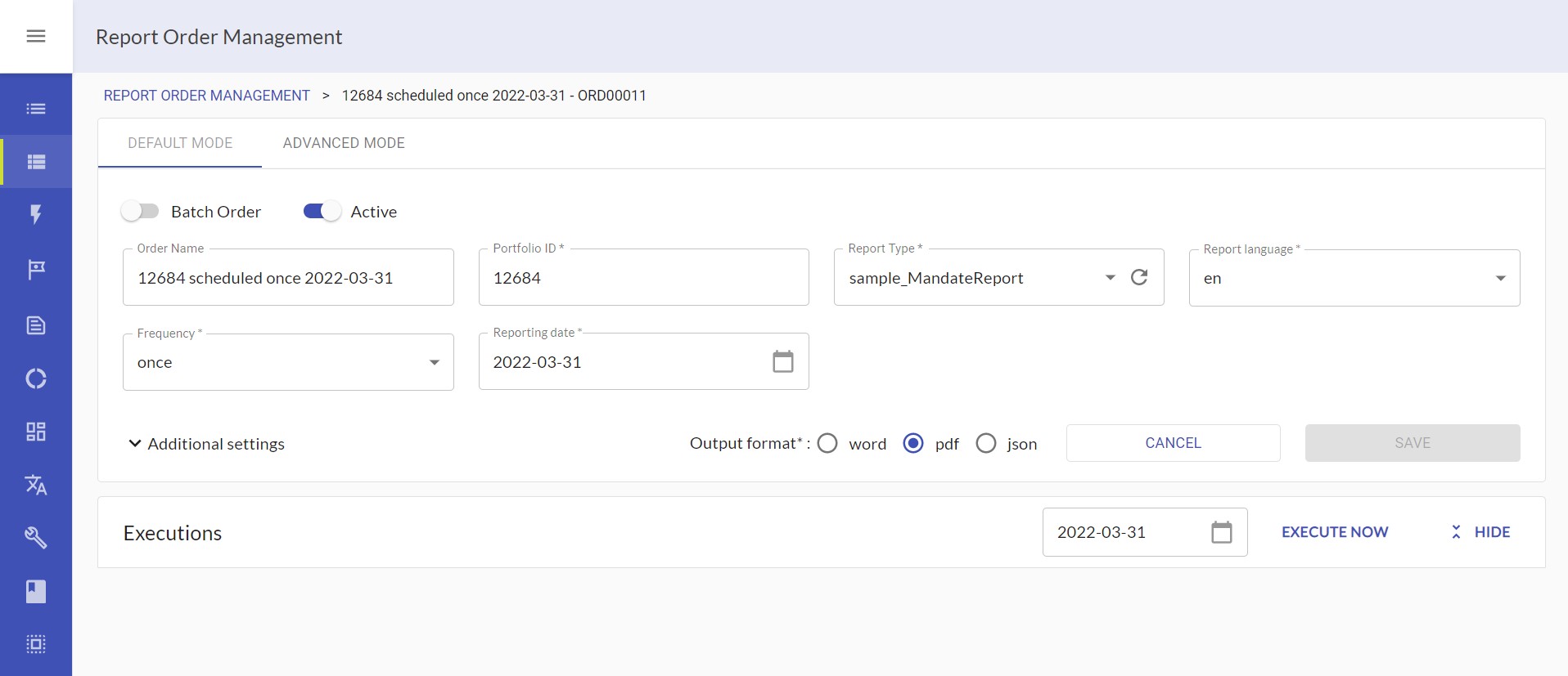Select a reporting date and click execute now. | ![]() Manually trigger a stored order - Producing a report |