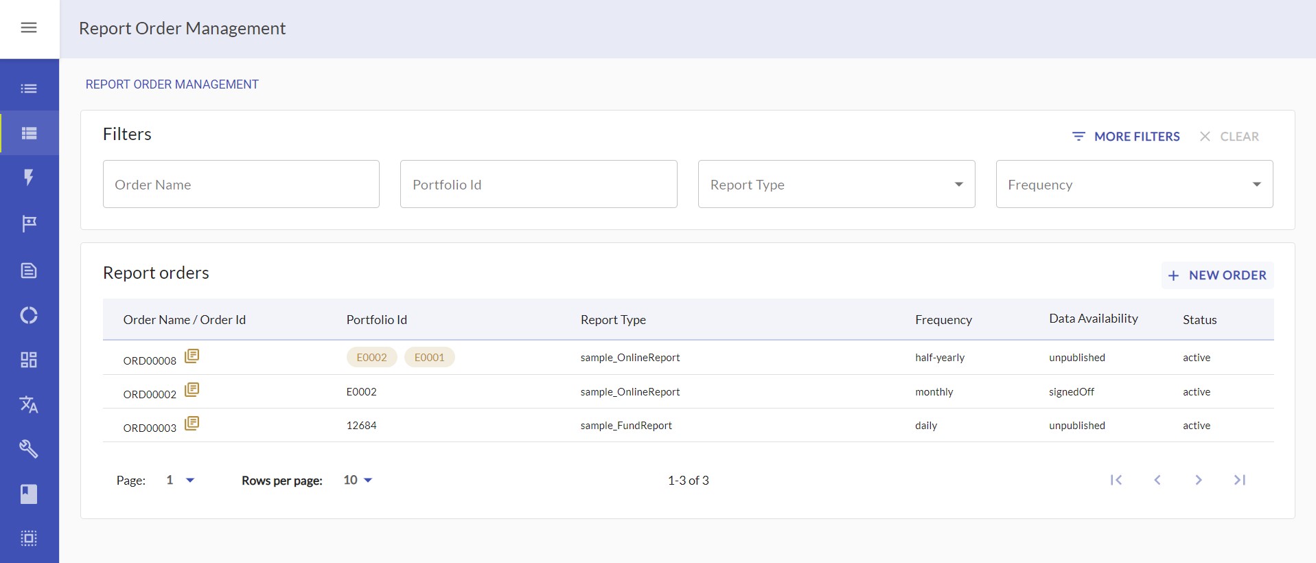 Open the report order management UI. To create an order, click on “New Order“. | ![]() Manually triggered order - Blank new order |